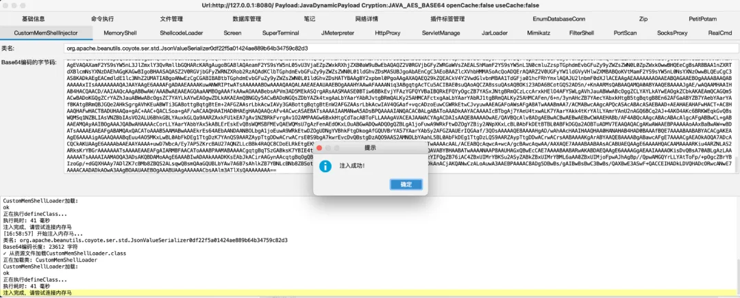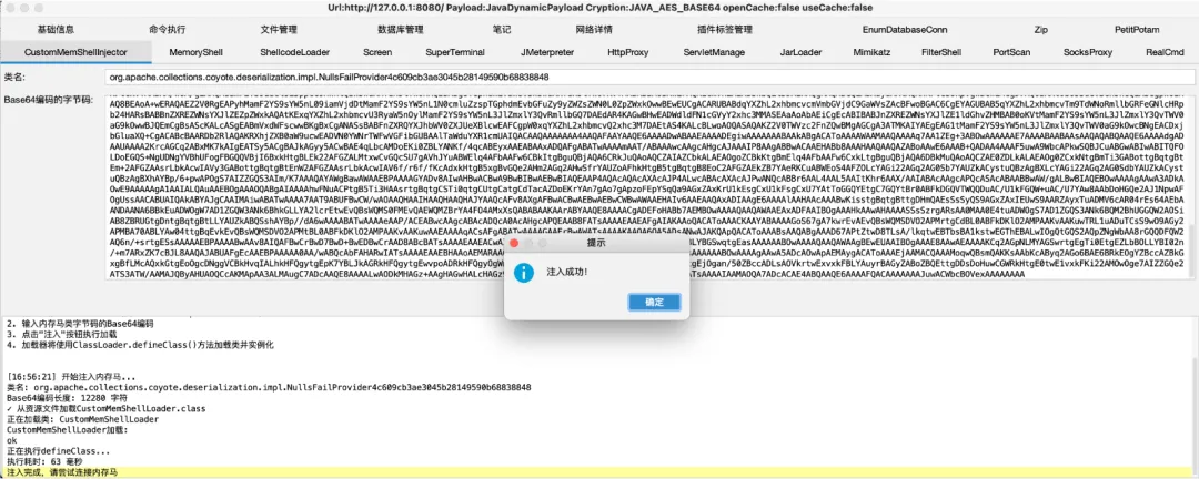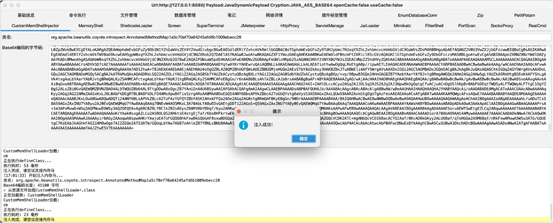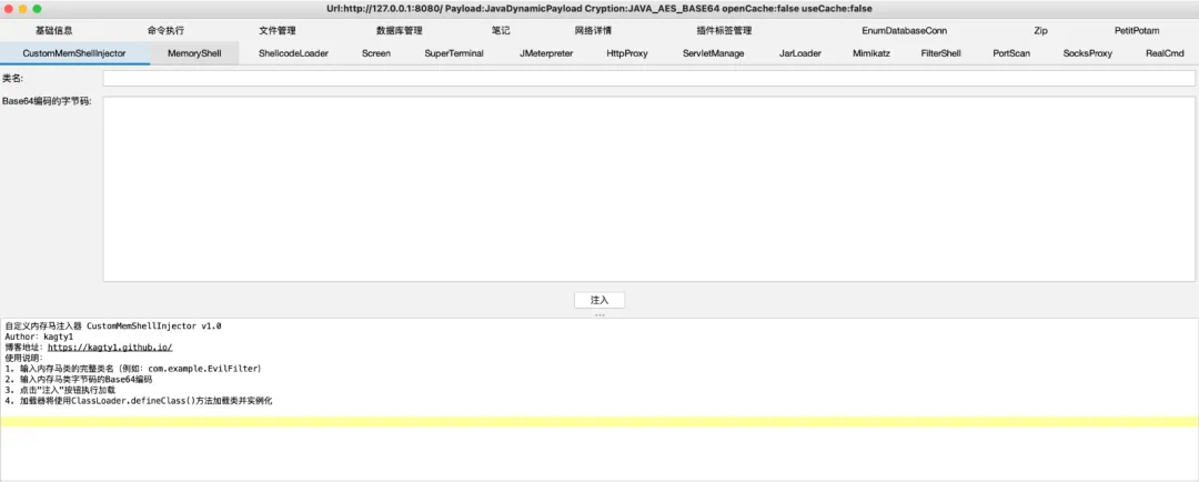 操作方式:在哥斯拉插件中提供一个文本框,用户粘贴 Base64 字符串后点击“注入”,即可完成内存马注入