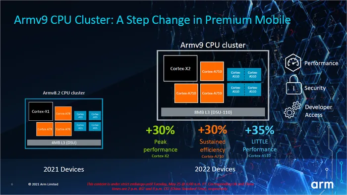 当前上市的最新一代安卓机所使用的高通骁龙8gen1处理器,以及即将上市的联发科天玑9000处理器,都属于最新设计的基于ARMv9架构的产品。它们都有一个共同的特点,就是文章开头所说的大核和小核微架构进行了大改,大核心使用了Cortex-X2微架构,而小核心则使用了Cortex-A510微架构。