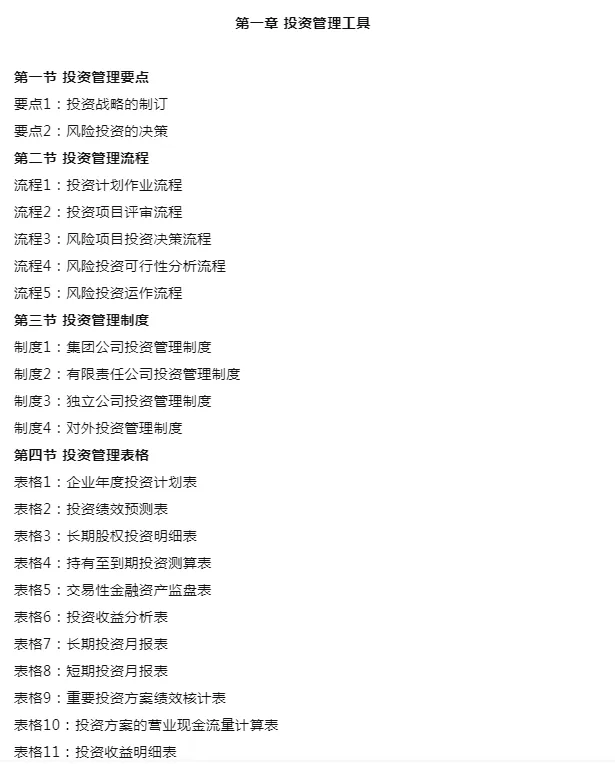 本套资料从投资管理、筹资管理、预算管理、往来账款管理具、资产管理、成本控制、税务管理、会计核算管理财务内审管理、会计内部控制10个方面对财务管理中常用的管理工具进行了解析。这套资料每章以“要点 流程 制度 表格”的形式,深入解析企业财务管理所需技巧,使整个财务管理知识体系一目了然。使用者者可以结合企业的实际情况随时拿来修改、运用,形成企业个性化的文本。