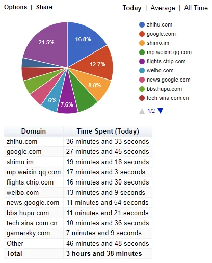 手机上统计 APP 使用时间已经屡见不鲜,而这款插件可以帮助你自动记录在各大网站上花费的时间。你可以看到其结果以饼状图的形式展现,并在饼状图的下方列出这些浏览记录的详细信息。从数据上给你工作规划的参考。