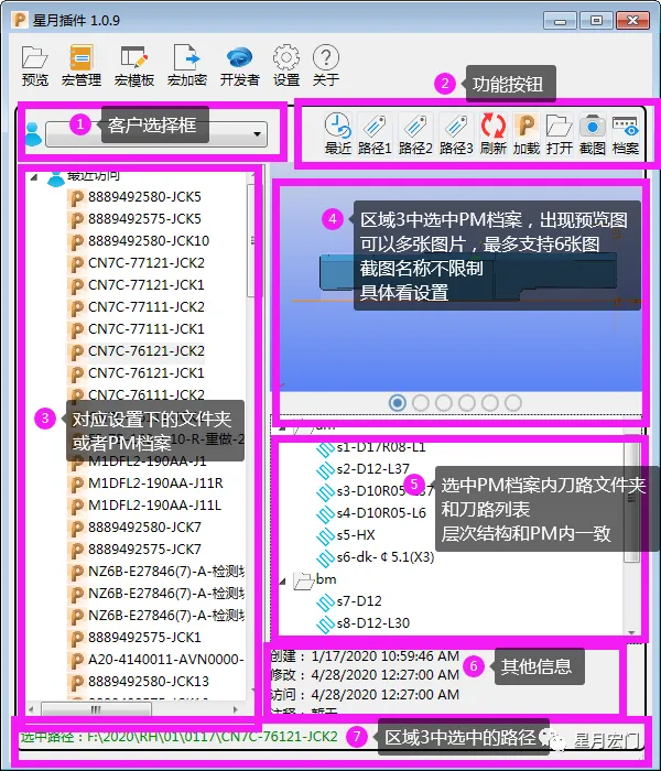区域1是选择客户(客户列表到设置里操作),选择后在区域3会显示该客户下的文件夹或者PM档案;