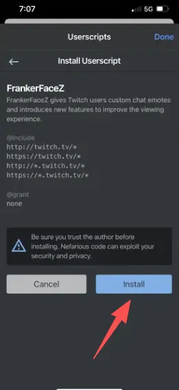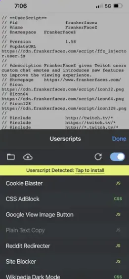 04 设置 Safari 浏览器扩展并管理脚本:在扩展管理里打开 Userscripts,点击 Tap to install,拉到底部点击 install 进行安装。All userscripts 列表可以看到已安装的脚本,亮色表示已启用,暗色表示未启用。