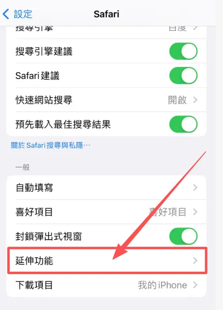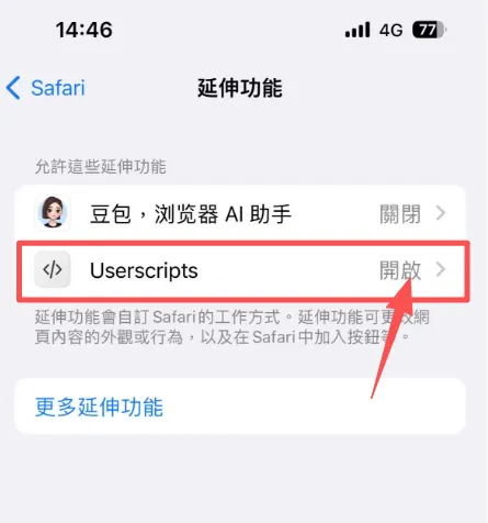 02 设置自带浏览器扩展:在 iOS 系统里打开设置,依次进入 设置 > Safari浏览器 > 扩展 > Userscripts,把扩展打开。随后打开 Safari 随便进入一个网页,就可以看到「Userscripts」选项了。