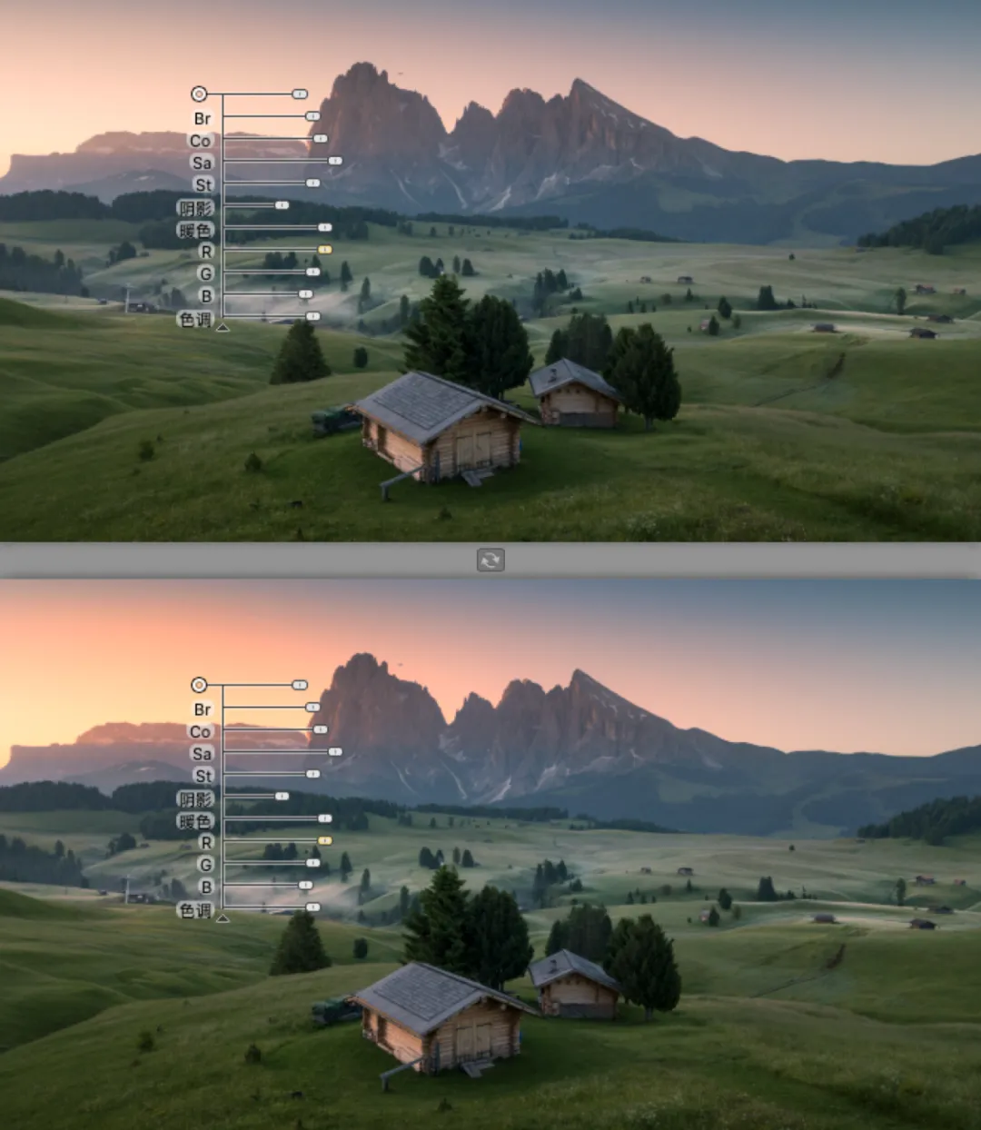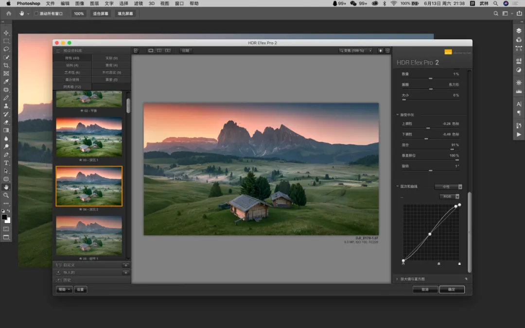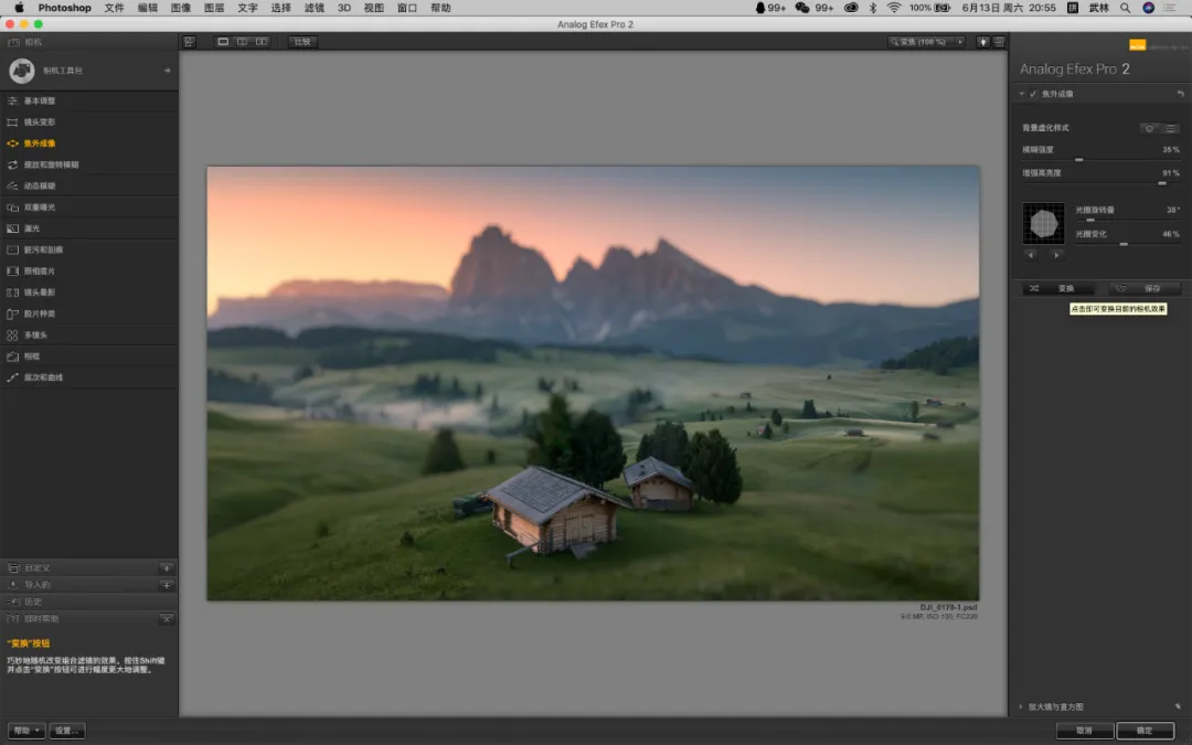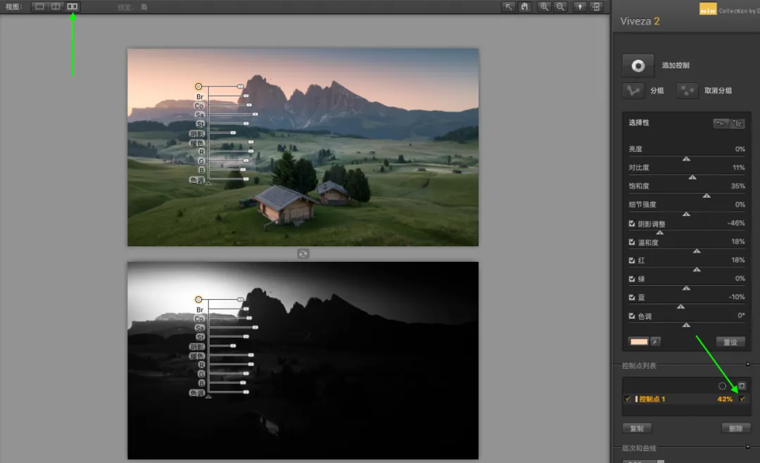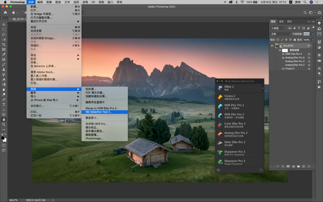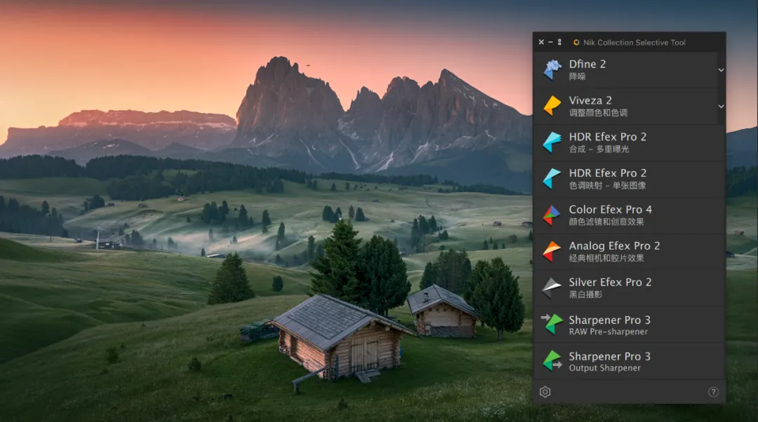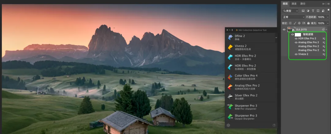 我在这里操作的是增加了天空的暖色,让光线的晕染更加的温暖。就软件提供的这个功能而言,已经是非常的人性化了,直接让你在照片上滑动进度条的方式调整,无需前往右侧面板进行调整,如果你喜欢右边的数值调整,也是可以的!可谓非常直观。② 选区建立,控制选区,观察选区当你建立控制点的时候,其实就已经做好的选区。这也是 U POINT 这项技术的特点!不需要你掌握图层蒙版的知识,你就能控制蒙版和选区。控制点可以精准的看到所控制的范围,一键无思考的点击,就能看到你心心念,心心难的精确蒙版,说的直白一些就是,你刚才的控制点局部操作控制了哪些地方。白色的区域代表刚才调整控制点调整的区域,非常直观和方便。你还可以通过控制点的范围大小,来决定选区范围的大小。如何显示选区?如下图,我们只要勾选右侧面板中的:控制点后面的的“对勾”按钮即可,画面直接转换为黑白灰蒙版的状态。右下角的“勾选”就是下方的箭头所示。对比图可以通过左上角的对比观看,这样你就更加直观的感受你所选择的蒙版,还可以进行实时的调整,这可是之前的的软件无法做到的,是一个非常大的进步,直观实用!③控制点着色 控制点还可以对画面进行着色,如果你喜欢某一个区域的颜色,或者色彩倾向,通过面板的吸管工具,也就是颜色选择器,就可以给任意画面进行着色处理。通过上方这个吸管,来选择颜色的样本。 我想单独的加强木屋受光面的亮度和暖色,并且还想让木屋受光面的色彩倾向与天空暖色一致,首选第一步先选择「增加控制」,将控制点放在木屋上,接下来点击「颜色控制器」(也就是吸管)吸引天空的暖色,这个时候房子就已经被着色了,接下来我通过上面的滑块来进行微调,调整过后的房子在前景中会变的更加突出立体!同时色彩与光源发起点保持一致。除了选区画面已有的颜色外,还可以通过颜色拾色器来进行选择适合的颜色。这个界面大家就很熟悉了,跟ps界面内的一样,更加方便的是你通过控制点就能做好选择什么地方增加颜色,而不需要再去做选区调整了。 就针对这一个工具当中的三个重点功能,是不是已经让你有了使用的冲动!它解决了大部分我们大家认为的难点,已经非常精准的控制了选区,以及局部效果,可以不让你纠结如何做到控制选区的问题。我还是第一次见到一个插件能拥有这么多功能,糟糕!是心动的感觉…… 二、完美解决了闪退不兼容的问题 Nik之前的一些老版本,为了防止闪退,需要操作一个步骤,就是选择应用到当前图层,即使是这样,也会在偶尔返回再次调整的时候出现闪退的情况。现在是完全可以大胆的选择应用滤镜效果到另一层,不用担心闪退的问题。如果你用RAW格式,并且在ACR或者LR中选择「在photoshop中打开为智能图层」的话,那么就会出现下图绿色框选的情况,每一个项目的调整,你都可以通过双击的方式,重复编辑和修改。但是当你应用的调整很多的时候,选择任意的一项重新编辑,然后确认,会非常的慢,软件会一直在运转,我测试了好几次,时间好像还挺久的,有几次我实在等不了,就强制退出了,这也许是我个人认为目前稍微有点慢的原因,不过并不影响使用。另外,在官网中还介绍了关于透视关系的矫正问题,主要用于几何缺陷的修正,这个用途其实就修正透视带来的畸变。我用我拍的一张照片放在其中作为实验,竟然没有反应,间接的说明我拍摄横平竖直(没有产生透视畸变)哈哈。通过Perspective Efex会自动纠正照片中的畸变,城市建筑和梯形畸变对它来说非常简单,风光摄影的广角以及长焦的畸变就更不用说了。但是目前网络上流传版本都没有这个功能,想尝试使用这个功能可以在官方的试用版本下载体验一下(官网的优惠是99.99USD,虽然优惠了,但是依然不便宜),上图的演示就是我下载试用版的一个体验,不过说实话,跟我在ACR中透视变化的调整基本上没有什么太大的区别,所以不必纠结,都能抵达罗马。三、一些有趣的功能模拟移轴的虚化效果,这些在ps中都可以模拟,但是这个模拟还能选择光圈的形状,可以说可调性比在ps中的乐趣更多一些。这这里面的可选非常多,大家可以尝试一下,在我看来是乐趣感,在这里我就不详细解读了,大家一看都能明白。HDR Efex Pro 2 的HDR风格也挺有特色,默认的这些设置,几乎都过于浓艳,还是需要根据自己的喜好在右栏中调整,找到适合自己的风格,还是那句话,千万不要套用模版。更新后的版本,颜值确实不低,这种灰调的高级感,在视觉感受上与ps也高度的统一。如果你安装了软件,发现没有这个界面,选择文件-自动-nik…就可以了,如下图。每次调整就不用再去点击滤镜-nik-再选择了,直接在小面板上选择即可,快捷方便。这以上所有功能都可以通过ACR和PS配合实现,请根据自己的喜好来进行,就比如我之前从来都不用,通过最近这段时间的使用,感觉效果就很不错,这是我最后的完成版本。四、获取练习素材及插件