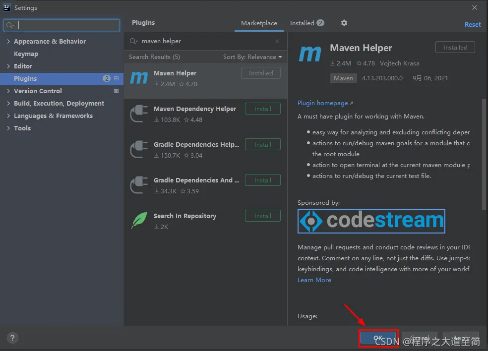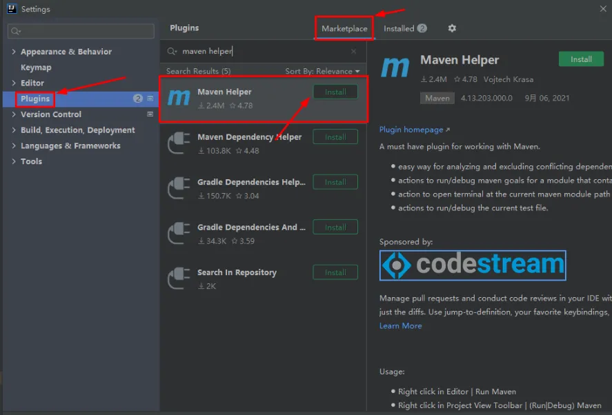 2、点击“Plugins”->“Marketplace”->输入”mavn helper”->点击“install”->点击“OK”完成安装