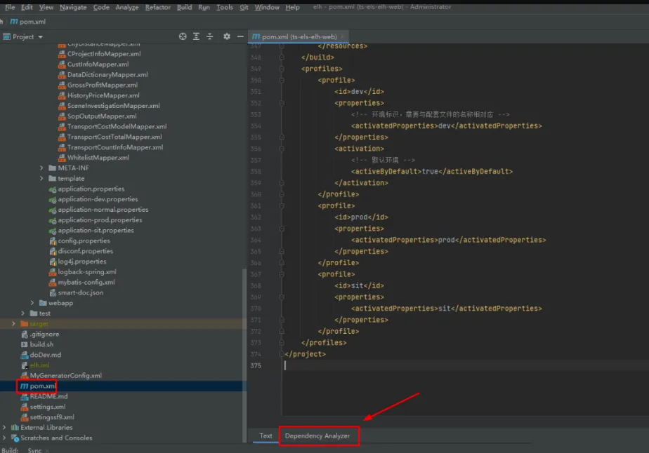 1、去到项目的pom.xml文件点击后,在pom.xlm右边显示下面多了个“Dependency Analyzer”的Tab选项,如下图所示: