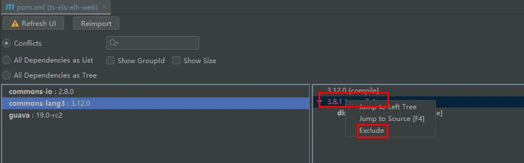 4、当出现冲突需要解决时,下面会显示冲突的信息,我们可以选择冲突的依赖 Exclude它。