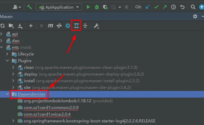 ②:或者右边的Mavn里面选择“Dependencies”后点击右上角“Show Dependencies”图标后,会显示出依赖关系图。