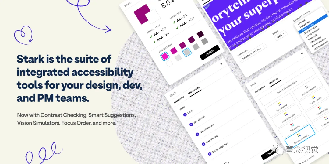 Stark 是一个提升界面可访问性的工具,它提供对比度检测、智能配色建议以及针对色盲用户的优化。这款工具的基础版本的功能就已经相当不错了,如果还不能满足你的需求可以看看它的付费版本。此外,它还有单独进行配色优化的工具 Able 和 拼写检查工具 Adee。