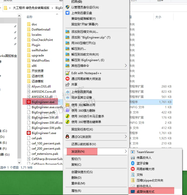 1、下载本站安装包,然后解压,解压后安装包不要放在桌面,我们把它剪切到自己存放软件的盘,比如D盘,然后打开文件夹找到bigengineer,鼠标右击,发送到桌面快捷方式