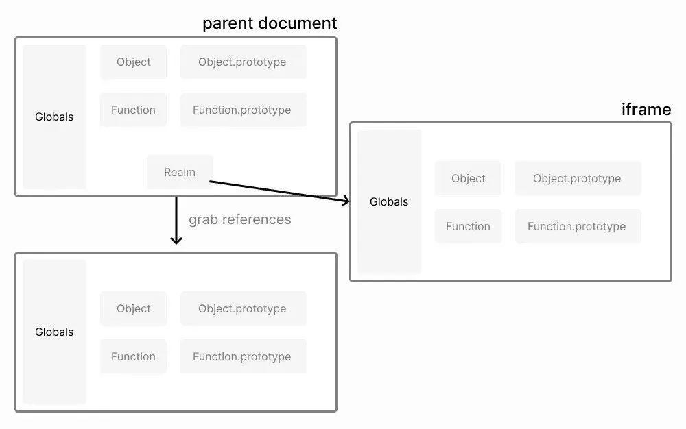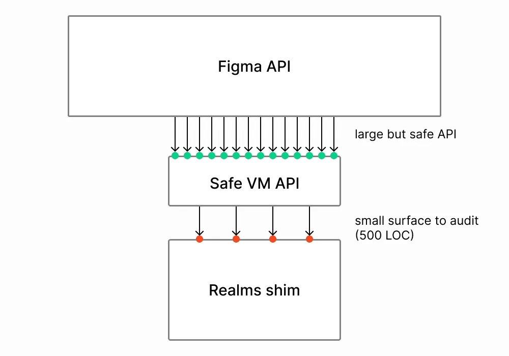 .├── README.md├── figma.d.ts├── manifest.json├── package-lock.json├── package.json├── src│ ├── code.ts│ ├── logo.svg│ ├── ui.css│ ├── ui.html│ └── ui.tsx├── tsconfig.json└── webpack.config.js在其 manifest.json 文件中包含了一些简单的信息: {"name": "React Sample","id": "738168449509241862","api": "1.0.0","main": "dist/code.js","ui": "dist/ui.html"}可以看出 Figma 将插件入口分为了 main 与 ui 两部分, main 中包含了插件实际运行时的逻辑,而 ui 则是一个插件的 HTML 片段。即 UI 与逻辑分离。安装一个Color Search 插件后观察页面结构可以发现 main 中的 js 文件被包裹在一个 iframe 里加载到页面上,关于 main 入口的沙箱机制后文中有详细的阐述。而 ui 中的 HTML 最终也被包裹在一个 iframe 里渲染出来,这将有效的避免插件 UI 层 CSS 代码导致全局样式污染。 Figma Developers 文档中 有一章节 How Plugins Run 对其插件系统运行机制进行了简单的介绍,简单来说 Figma 为插件中逻辑层的 main 入口创建了一个最小的 JavaScript 执行环境,它运行在浏览器主线程上,在这个执行环境中插件代码无法访问到一些浏览器全局的 API,从而也就无法在代码层面对 Figma 本身运行造成影响。而 UI 层有且仅有一份 HTML 代码片段,在插件被激活后被渲染到一个弹窗中。 Figma 官方博客中对其插件的沙箱机制做了详细的阐述。起初他们尝试的方案是 iframe,一个浏览器自带的沙箱环境。将插件代码由 iframe 包裹起来,由于 iframe 天然的限制,这将确保插件代码无法操作 Figma 主界面上下文,同时也可以只开放一份白名单 API 供插件调用。乍一看似乎解决了问题,但由于 iframe 中的插件脚本只能通过 postMessage 与主线程通信,这导致插件中的任何 API 调用都必须被包装为一个异步 async/await 的方法,这无疑对 Figma 的目标用户非专业前端开发者的设计师不够友好。其次对于较大的文档,postMessage 通信序列化的性能成本过高,甚至会导致内存泄漏。 Figma 团队选择回到浏览器主线程,但直接将第三方代码运行在主线程,由此引发的安全问题是不可避免的。最终他们发现了一个尚在 stage2 阶段的草案 Realm API。Realm 旨在创建一个领域对象,用于隔离第三方 JavaScript 作用域的 API。 let g = window; // outer globallet r = new Realm(); // root realmlet f = r.evaluate("(function() { return 17 })");f() === 17 // trueReflect.getPrototypeOf(f) === g.Function.prototype // falseReflect.getPrototypeOf(f) === r.globalThis.Function.prototype // true值得注意的是,Realm 同样可以使用 JavaScript 目前已有的特性来实现,即 with 与 Proxy。这也是目前社区比较流行的沙箱方案。 const whitelist = {windiw: undefined,document: undefined,console: window.console,};const scopeProxy = new Proxy(whitelist, {get(target, prop) {if (prop in target) {return target[prop]}return undefined}});with (scopeProxy) {eval("console.log(document.write)") // Cannot read property 'write' of undefined!eval("console.log('hello')") // hello}前文中 Figma 插件被 iframe 所包裹的插件 main 入口即包含了一个被 Realm 接管的作用域,你可以认为是类似这段示例代码中的一份 白名单 API,毕竟维护一份白名单比屏蔽黑名单实现起来更简洁。但事实上由于 JavaScript 的原型式继承,插件仍然可以通过 console.log 方法的原型链访问到外部对象,理想的解决方案是将这些白名单 API 在 Realm 上下文中包装一次,从而彻底隔离原型链。 const safeLogFactory = realm.evaluate(`(function safeLogFactory(unsafeLog) {return function safeLog(...args) {unsafeLog(...args);}})`);const safeLog = safeLogFactory(console.log);const outerIntrinsics = safeLog instanceOf Function;const innerIntrinsics = realm.evaluate(`log instanceOf Function`, { log: safeLog });if (outerIntrinsics || !innerIntrinsics) throw new TypeError();realm.evaluate(`log("Hello outside world!")`, { log: safeLog });显然为每一个白名单中的 API 做这样操作的工作是非常繁杂且容易出错的。那么如何构建一个安全且易于添加 API 的沙箱环境呢? Duktape 是一个由 C++ 实现的用于嵌入式设备的 JavaScript 解释器,它不支持任何浏览器 API,自然地它可以被编译到 WebAssembly,Figma 团队将 Duktape 嵌入到 Realm 上下文中,插件最终通过 Duktape 解释执行。这样可以安全的实现插件所需 API,且不用担心插件会通过原型链访问到沙箱外部。 这是一种被称为 Membrane Pattern 的防御性的编程模式,用于在程序中与子组件(广义上)实现一层中介。简单来说就是代理(Proxy),为一个对象创建一个可控的访问边界,使得它可以保留一部分特性给第三方嵌入脚本,而屏蔽一部分不希望被访问到的特性。关于 Membrane 的详细论述可以查看 Isolating application sub-components with membranes[1] 与 Membranes in JavaScript[2] 这两篇文章。 这是最终 Figma 的插件方案,它运行在主线程,不需要担心 postMessage 通信带来的传输损耗。多了一次 Duktape 解释执行的消耗,但得益于 WebAssembly 出色的性能,这部分消耗并不是很大。 另外 Figma 还保留了最初的 iframe ,允许插件可以自行创建 iframe ,并在其中插入任意 JavaScript ,同时它可以与沙箱中的 JavaScript 脚本通过 postMessage 相互通信。 五 鱼和熊掌如何兼得?