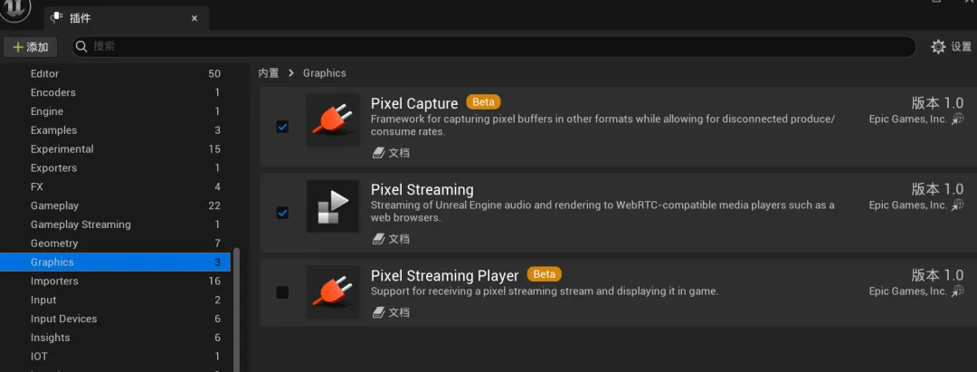 进入之后,在图形(Graphics)中找到Pixel Streaming,并勾选该插件,随后会要求你进行UE的重启,点击重启即可。