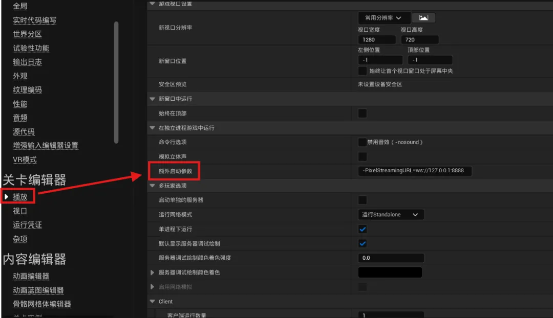 在关卡编辑器(Level Editor)中的播放(Play)栏下找到额外启动参数(Additional Launch Parameters)设置,将其值设为