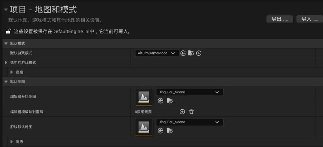 例如在我这里,使用的就是AirSim游戏模式(需要进行无人机仿真)和一个当前正在使用的场景关卡;