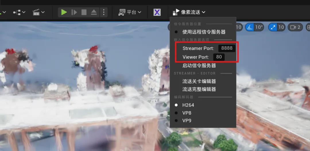 开启Pixel Streaming插件之后,就可以在UE编辑器界面中看到相应的推送设置,在此处还可以修改像素流推送和监听的端口;