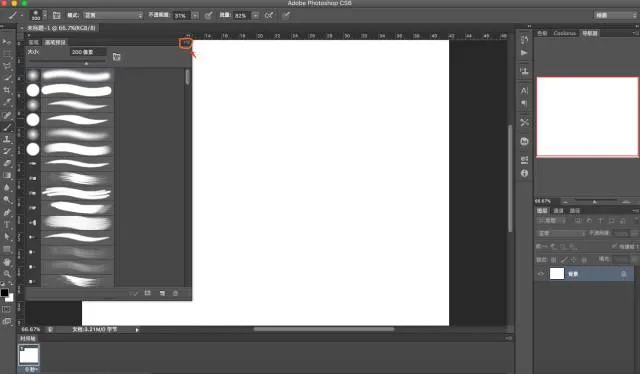(1) 打开PS,新建一个空白文件,点击画笔,然后打开画笔面板(F5),点击面板右上角的小三角: