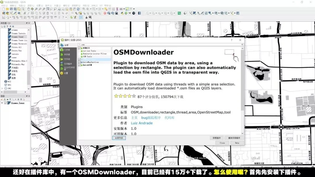 还好在插件库中,有一个OSMDownloader,目前已经有15万+下载了。怎么使用呢?首先先安装下插件。