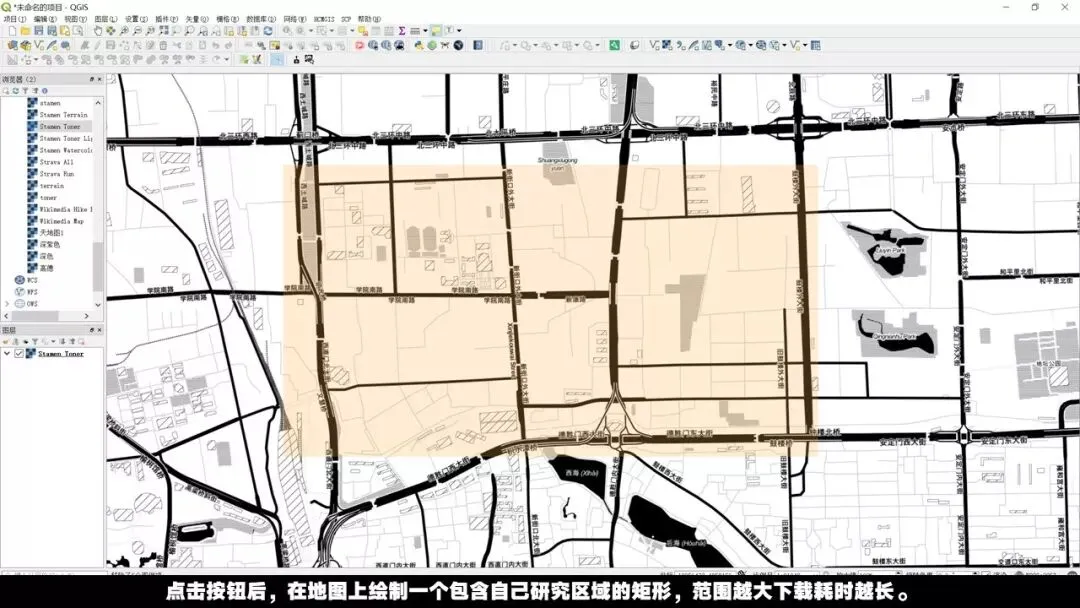 点击按钮后,在地图上绘制一个包含自己研究区域的矩形,全球任意区域都可以噢,范围越大下载耗时越长。