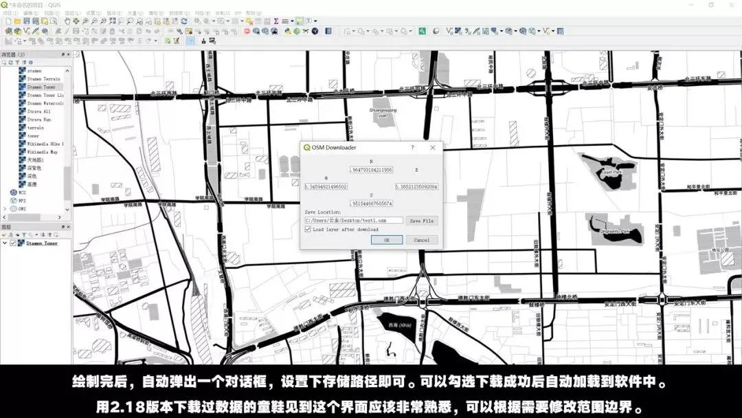 绘制完后,自动弹出一个对话框,设置下存储路径即可。可以勾选下载成功后自动加载到软件中。用2.18版本下载过数据的童鞋见到这个界面应该非常熟悉,可以根据需要修改范围边界。