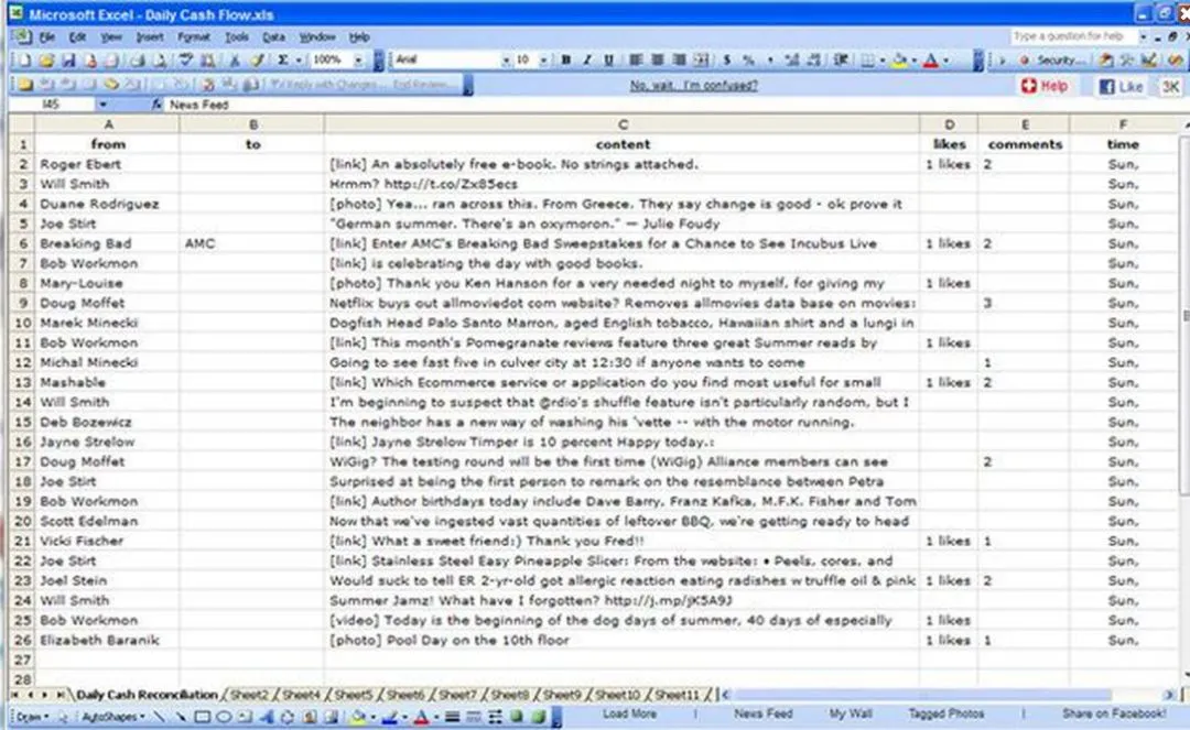 只要在网页上登录自己的 Facebook 账号,网页就会把你 Facebook 上发的消息以表格的形式展现出来,还能显示你发的 “ 朋友圈 ”收获了几个赞。。。