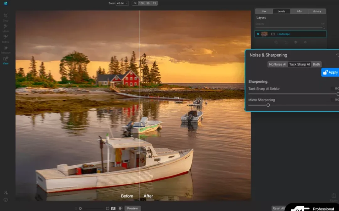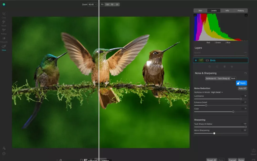 利用先进的机器学习来构建 AI 网络,以消除亮度和颜色噪声,同时保持细节,这是其他应用程序无法产生的出色结果;