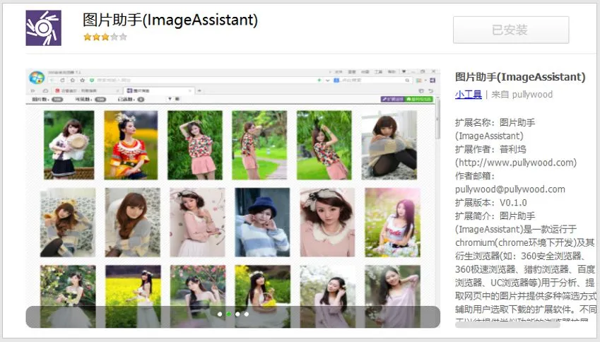 这款插件的名字叫:图片助手,支持谷歌以及以谷歌为内核的360、百度、UC、猎豹等各种主流浏览器。