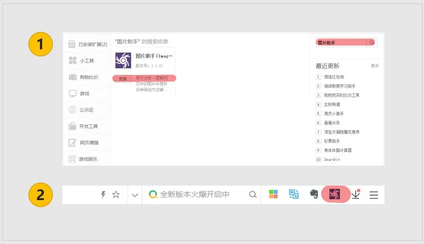 以鸟叔的360浏览器为例,只需要在应用商店里搜索并找到图片助手,选择添加即可。