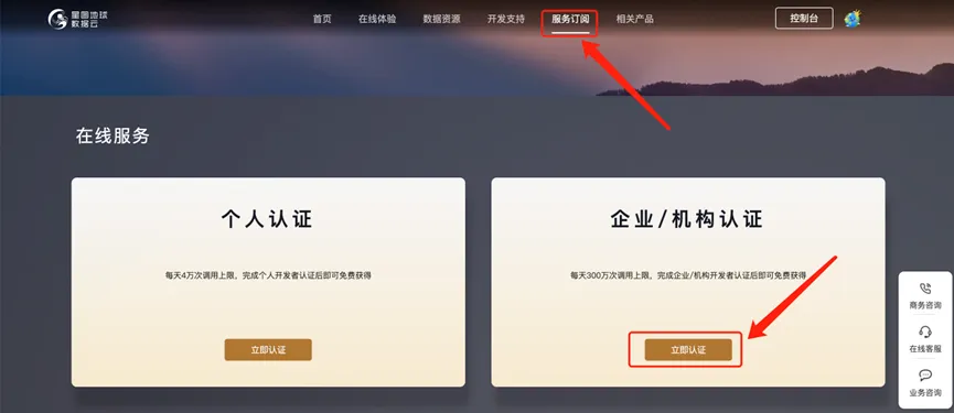 点击“服务订阅”,选择并完成“企业/机构认证”相关信息填写