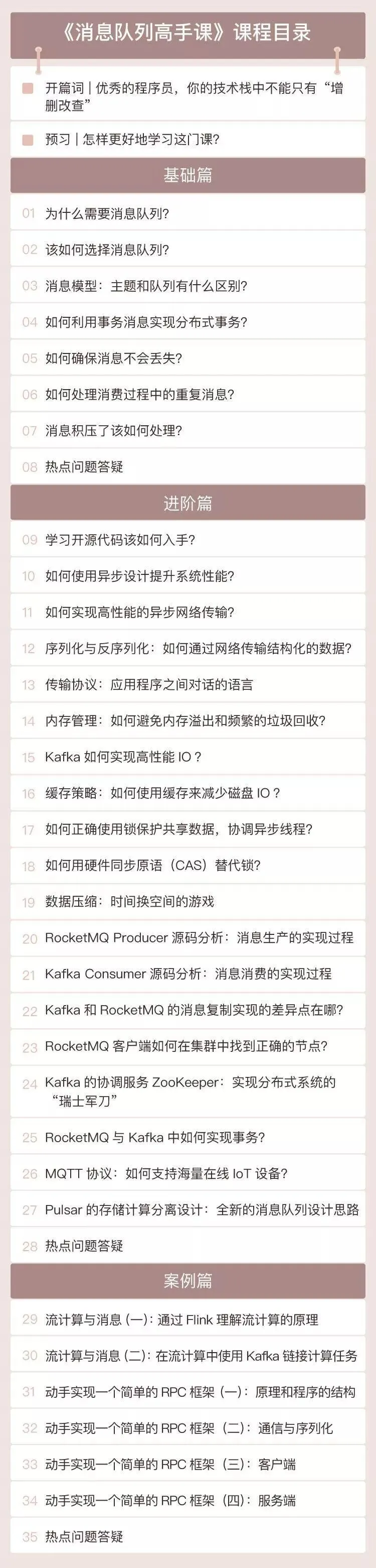 在《消息队列高手课》专栏中,我将从基础、进阶、案例三个部分来讲。