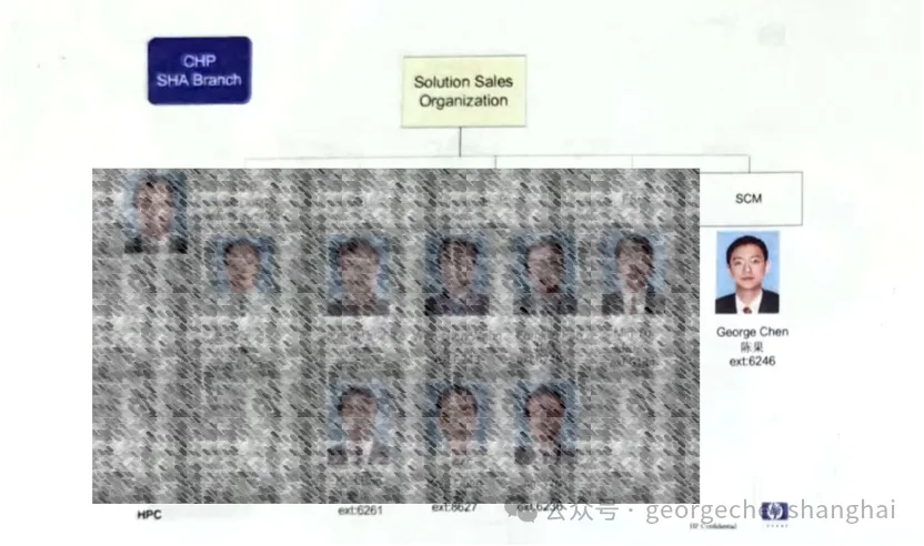 当时在国内有 SAP 能力的国际IT 服务公司还有通用汽车在八十年代收购在九十年代中期又分拆出来的EDS,以及来自德国的西门子企业服务部门等,不过这些公司主要服务使用 SAP 的外企。就连惠普、康柏/DEC、Unisys等当时的国际IT 大厂都没有专门的 SAP 咨询能力;我是惠普的第一批 做SAP 咨询的顾问,但是公司并没有成建制的 SAP 团队,直到 2003 年开始建 GDCC交付中心,以及惠普在欧洲收购汉思,在国内主要做 SAP的汉思团队合并进惠普中国,才算是有了 SAP 队伍。下图是 2001 年惠普咨询制造业行业销售团队上海的组织结构图。