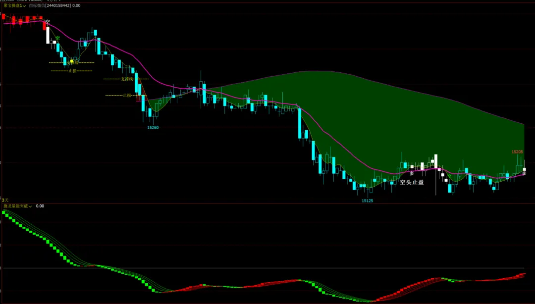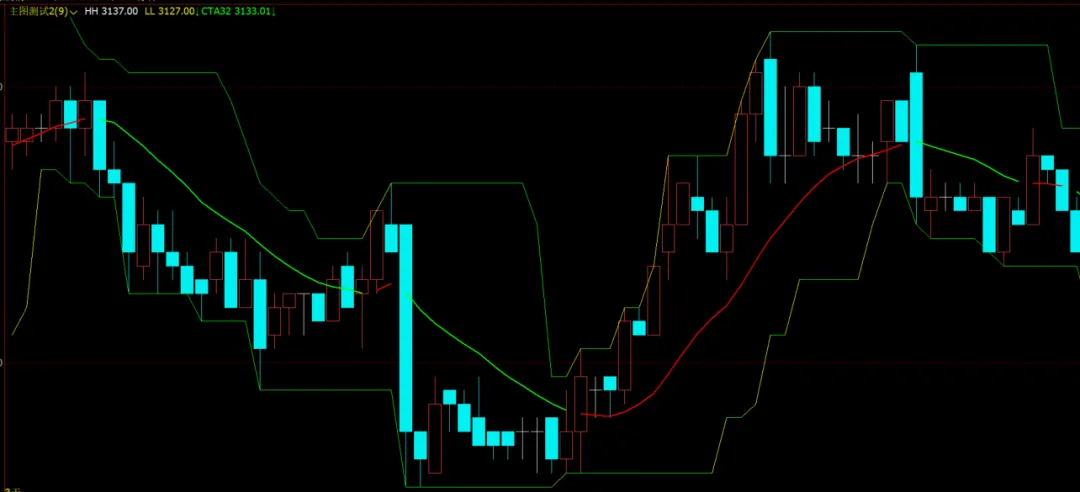 CTA32:IF(CTA25,CTA30,NULL),LINETHICK2,COLORGREEN; // 空头趋势时,中间线显示为绿线