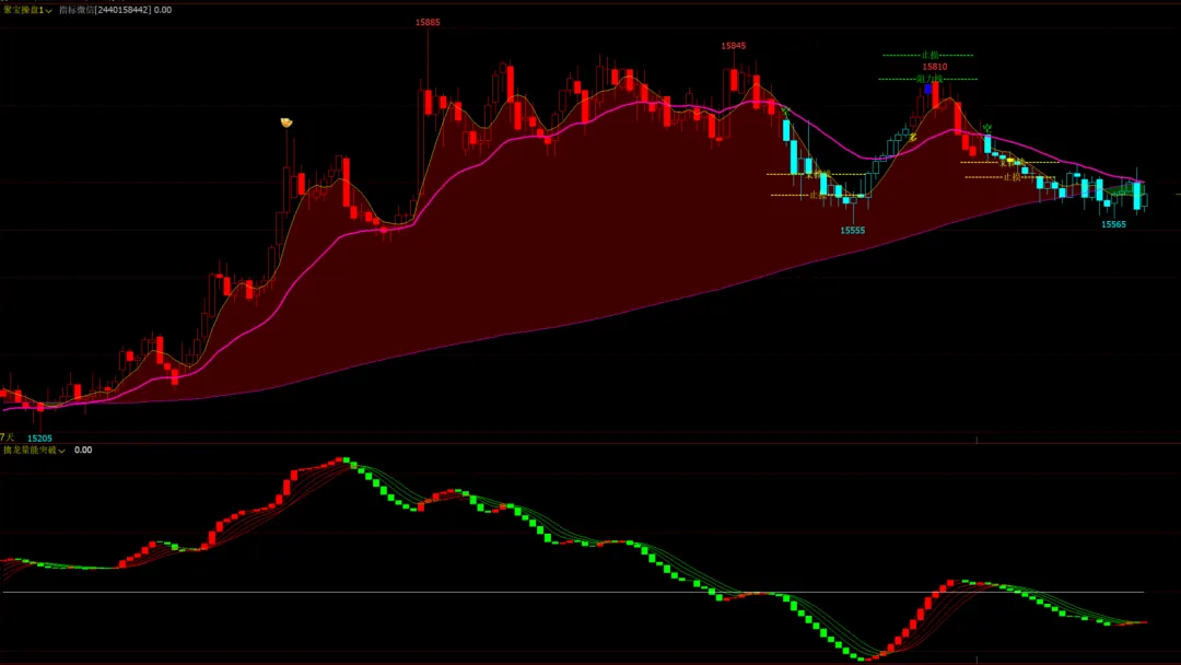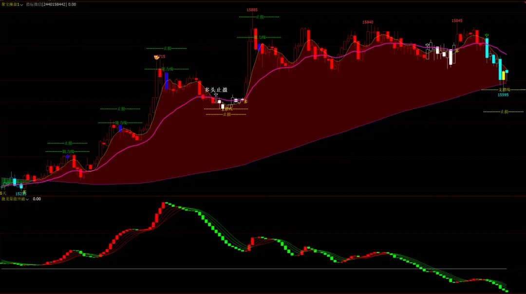 1、指标名称:擒龙顺势博金主图+聚宝macd拐点幅图+苍穹量柱趋势幅图,主图幅图无未来函数