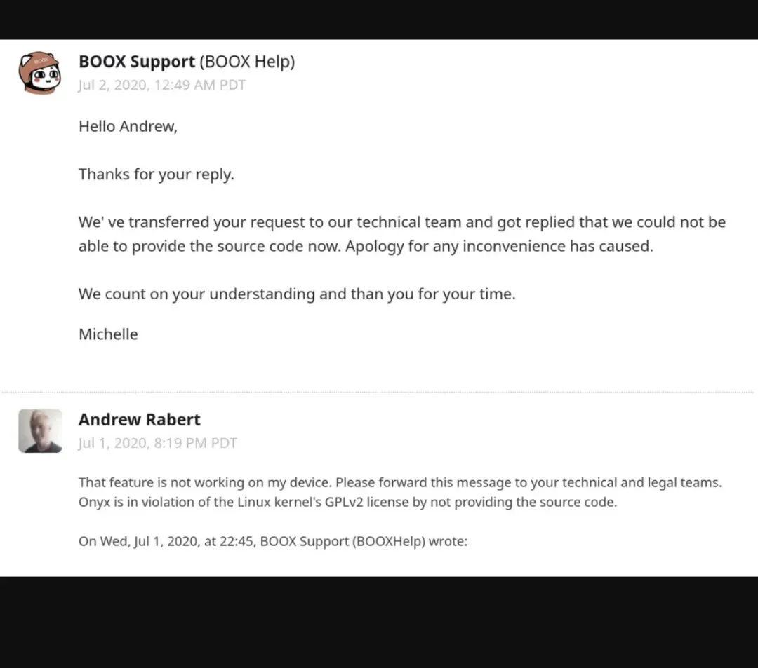国内电子书厂商文石(Onyx)被指拒绝发布其电子书设备源码,违反 GPL v2 开源协议。根据曝光出来的截图显示,有人向上述厂商指明了违规问题,但 Onyx 官方回应“技术团队无法公开源码”,并希望得到谅解,这件事情一经社区公布,就引起了激烈讨论。