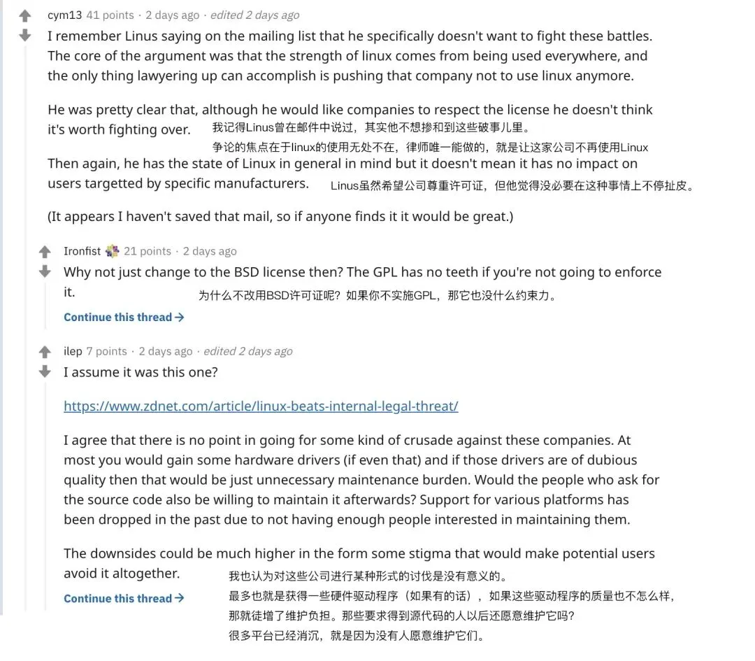 Linux 缔造者 Linus Torvalds 早年间在回答 “Linux 如何对一家违反 GPL 的公司提起诉讼” 的问题时就曾表达过一些对此类事件的看法:希望公司尊重许可,但 Linux 的使用无处不在,没有必要在这种事情上不停纠缠下去。