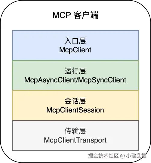 在上一章中,我们深入解析了 MCP 客户端与服务端在 SSE 模式下的核心交互流程,从构建与连接、初始化,到工具的发现与调用,全流程呈现了分层架构下各模块的协作机制。理解了交互逻辑之后,本章将以 Spring AI MCP 的源码为基础,剖析其核心组件的实现细节,以更好地理解其内部的运作方式。