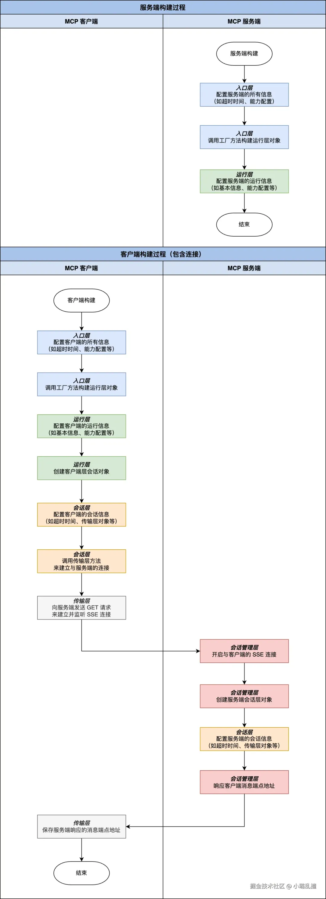 与服务端类似,在入口层中配置了客户端的所有信息(如超时时间、能力配置)后,调用其工厂方法就能构建出一个客户端运行层实例。但有所区别的是,客户端还需要创建出其会话层对象。在配置完会话层对象后(需要配置超时时间、传输层对象等),还需要调用传输层方法来建立与服务端的连接,此时会向客户端发送 GET 请求来建立并监听 SSE 连接。服务端的会话管理层接收到后,会开启 SSE 连接,并为客户端创建一个会话层对象,最后再返回客户端消息端点地址(之后客户端需要向这个地址发送业务交互消息)。在客户端收到响应后,会保存这个消息端点地址,至此客户端的构建过程才算结束。