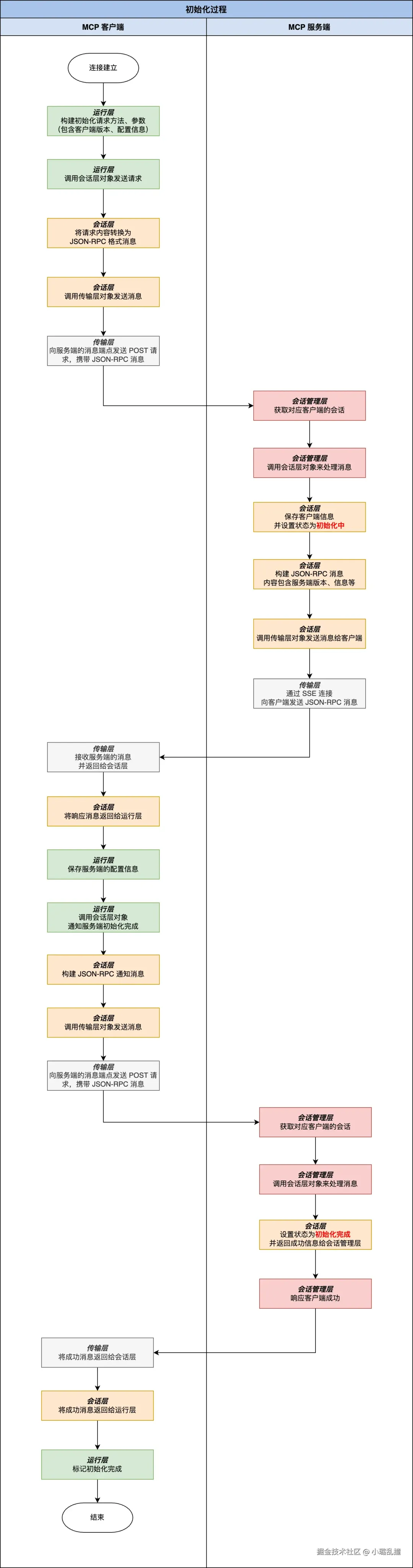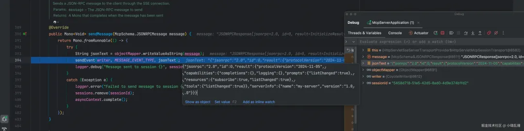服务端的会话管理层接收到后,会取出连接过程时创建的会话层对象,然后让其来处理这个消息。会话层对象会保存客户端消息,并设置状态为初始化中,之后构建 JSON-RPC 响应消息(内容包含服务端版本、信息等),再调用传输层对象发送消息给客户端。最后传输层对象则通过 SSE 连接向客户端发送这个 JSON -RPC 消息。