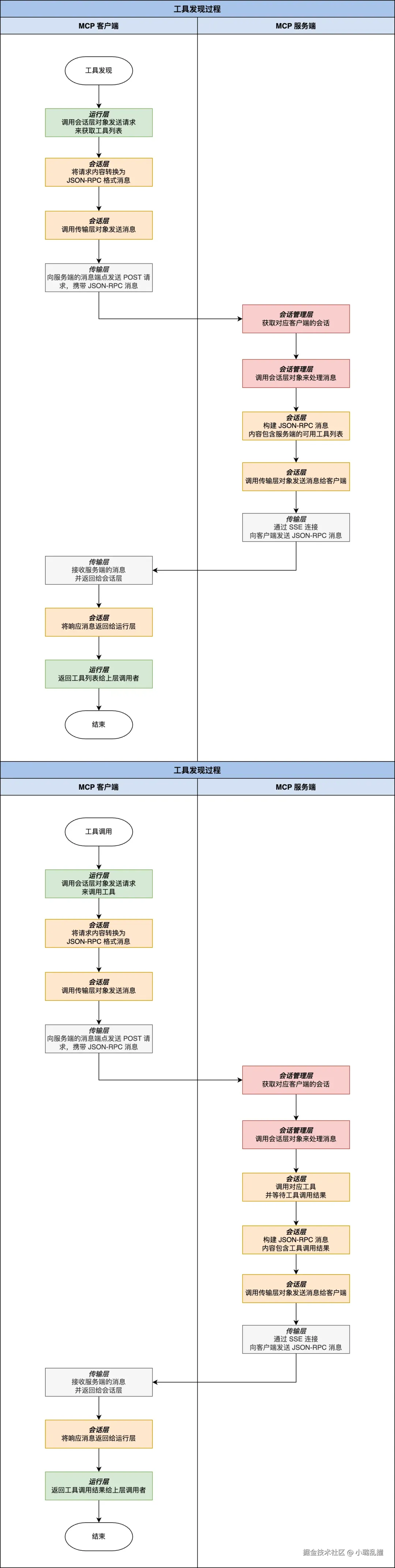 整个过程其实和工具发现过程非常类似,这里就不再赘述。唯一的区别在于服务端的会话层对象执行逻辑不同,此时其会调用相应的工具并等待调用结果,最后再把这个结果通过传输层返回给客户端。