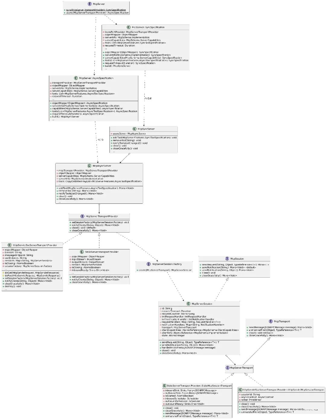 这里先给出 MCP 客户端、服务端的完整类图,后续会逐层拆分这个类图,自上而下地讲解各个层次涉及到的源码。这里我使用的源码版本为 0.10.0(github.com/modelcontex…),对应 Spring AI 1.0.0 版本内使用的 mcp 版本。