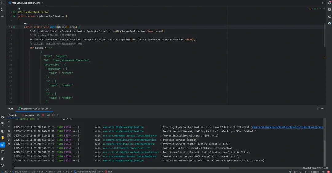 在前面的章节中,我们从架构、交互流程、核心源码三个角度剖析了 Spring AI MCP 的整体设计与关键实现,理清了各层之间的职责划分与调用关系。为了让大家能直观地看到 MCP 在实际运行时的交互过程,这一章将通过断点调试的方式,以服务端源码的视角,深入演示 SSE 模式下客户端与服务端初始化的过程。在理解了初始化这个比较复杂的过程后,其他的过程也是非常类似的,感兴趣的同学可以按照下面的步骤搭建好环境后自行调试。