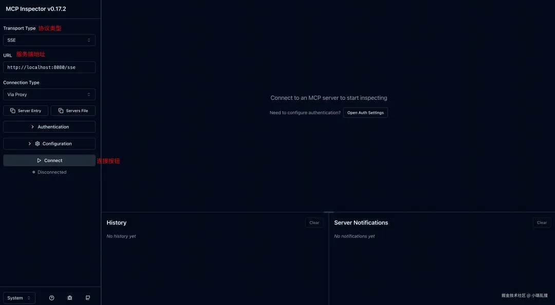 这里我使用的 MCP 客户端是 MCP Inspector,它是一个用于调试、测试和可视化交互的工具,相当于一个图形化的 MCP 客户端,可以直观地查看、调用和调试 MCP Server 的各种能力。安装了 Node.js 后,就可以用下面的命令启动 MCP Inspector: