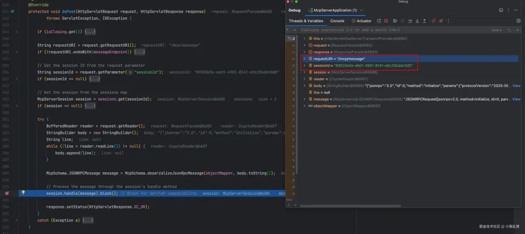 在第三章讲解初始化过程时,提到初始化过程包含两大步骤:初始化建立、初始化完成通知,而对于这两个步骤,客户端都会发送 POST 请求,因此这里首先需要把断点设置在服务端会话管理层HttpServletSseServerTransportProvider 中接收 POST 请求的方法 doPost()。在 MCP Inspector 中触发这一步骤的方式就是点击 Connect 按钮,在连接完成后,就会发送 POST 请求触发初始化过程。