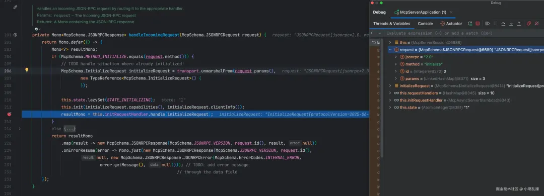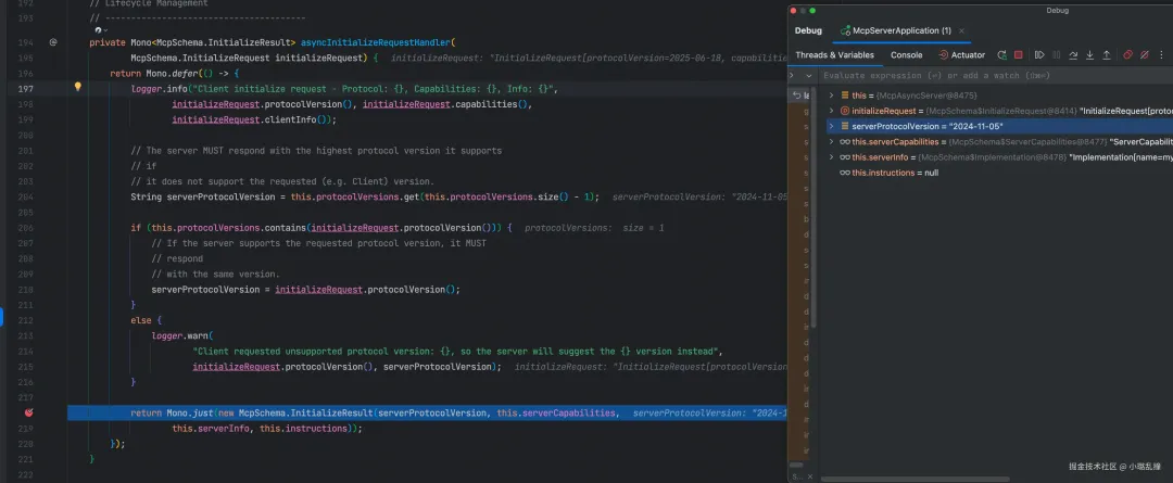 处理器的实现对应于 asyncInitializeRequestHandler() 方法(这个方法的定义在运行层 McpAsyncServer 中,以 lambda 的方式传给了会话对象),这个方法会构建给客户端的返回结果,即服务端的基本信息、协议版本等。如下所示。