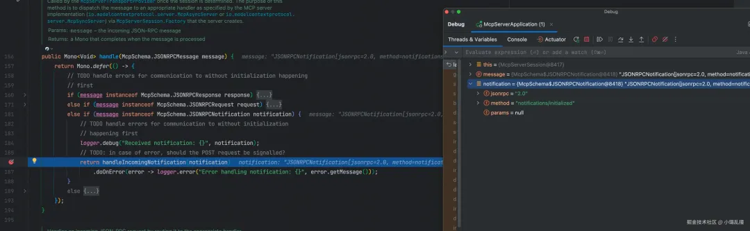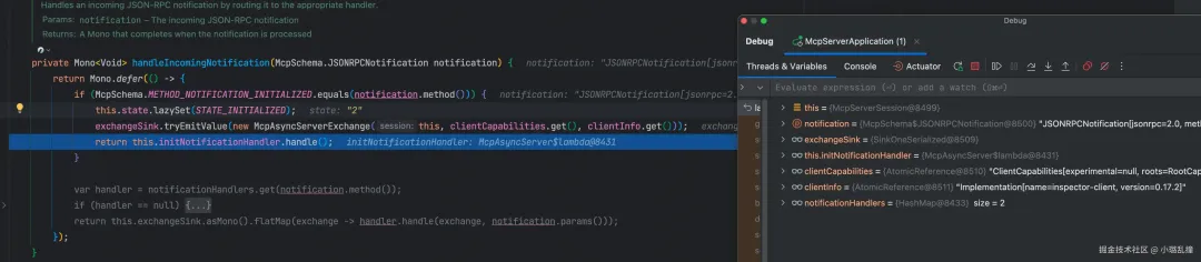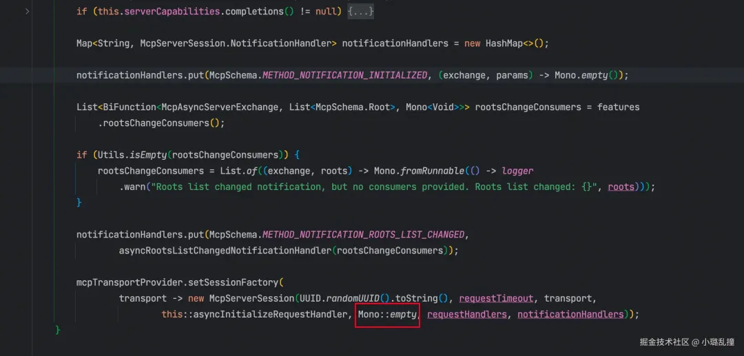而这个处理器实际上并没有做任何事情,在运行层 McpAsyncServer 构造方法中 lambda 设置为 Mono::empty,即不做任何事。如下所示。