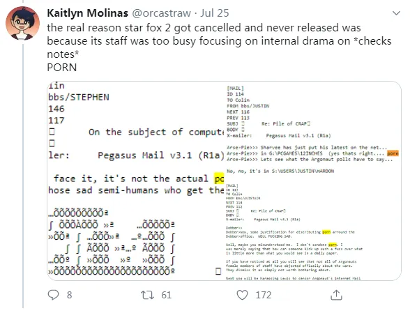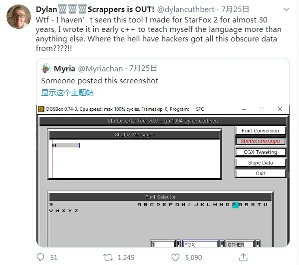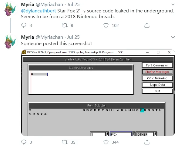他还同时发布了泄漏数据的照片,这些照片是30年前他为Star Fox 2制作的工具,他在推特上十分震惊地评论道“黑客到底从哪里得到这些数据的?”
