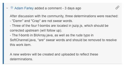 他还提交了一个变更集来删除 12 处脏话。