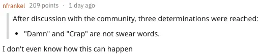 nfrankel:我就不搞不懂了,为啥 Damn 和 Crap 居然不算脏话了。