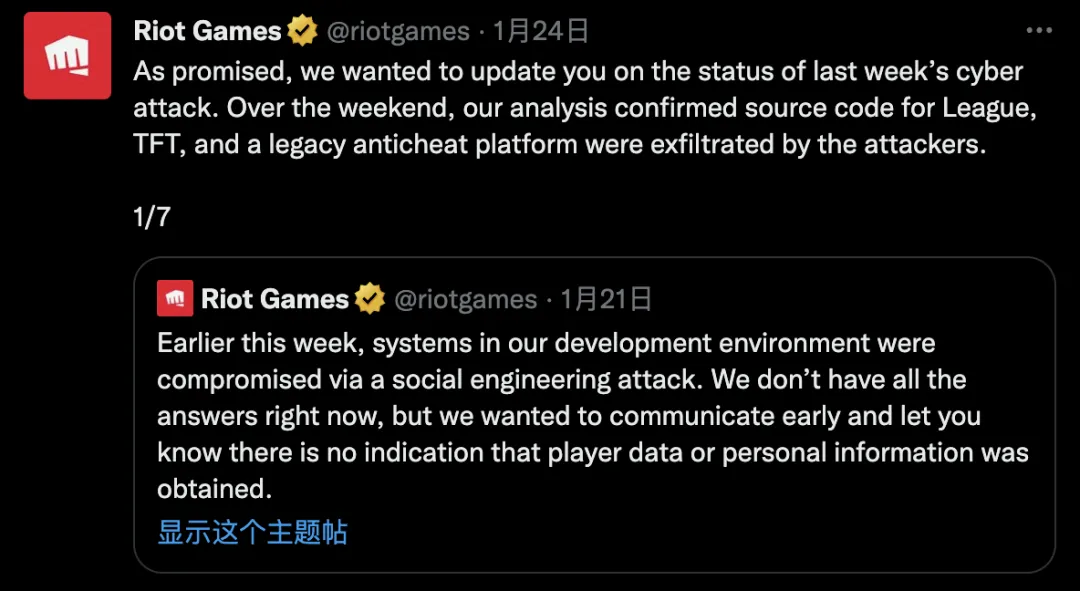 1 月 24 日,拳头公司对此次攻击的调查有了新进展。其分析证实了《英雄联盟》、《云顶之弈》和一个反作弊平台的源代码已泄露。