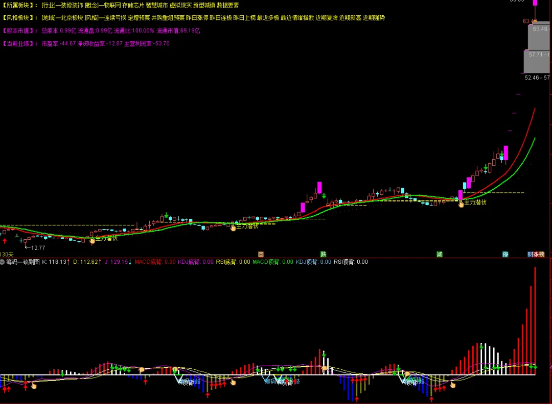 DRAWTEXT (拉升一号,L*0.97,’↖主力潜伏’),COLORYELLOW;