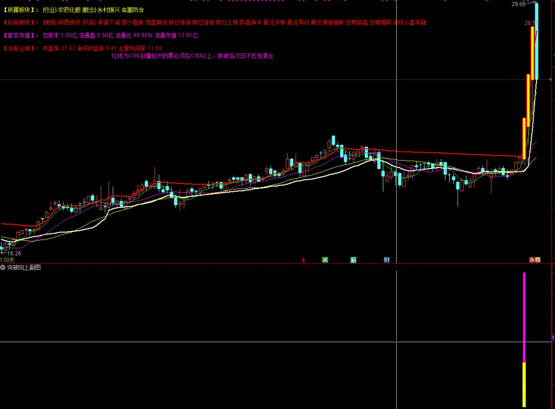 DRAWTEXT_FIX(1,0.2,0.2,0,’ 红线为C90,放量拉升的票必须在C90以上,跌破后次日不反包清仓 ‘),COLORFF00FF;